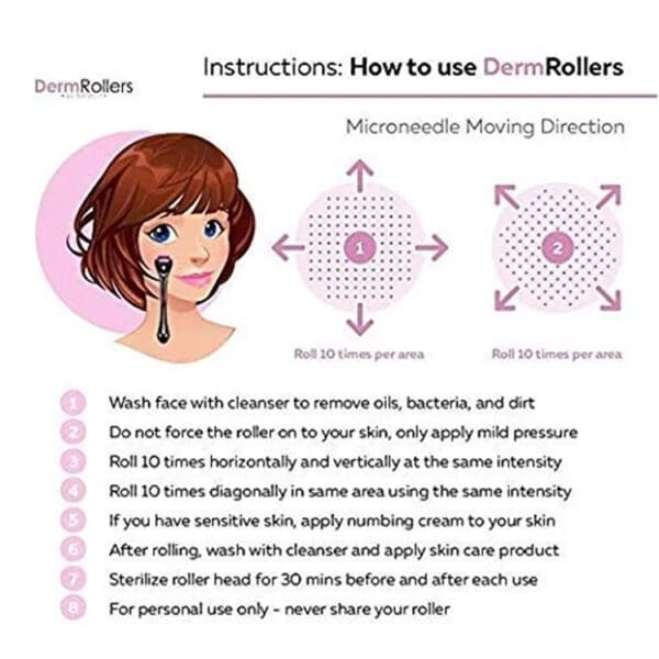 HOW TO USE: Rinse your derma roller in warm water. Disinfect it by soaking it in Isopropyl alcohol. Start rolling in one direction 6 to 8 times, depending on your skin tolerance and sensitivity, and make sure to lift the roller after each pass. So, roll in one direction. Lift up. Repeat. You should have rolled over each area 12 to 16 times — 6 to 8 horizontally, 6 to 8 vertically. Now rinse your face with water only.