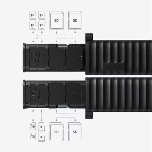 Flash card box has a huge internal storage space, which can simultaneously store 4 SD cards, 4 TF cards, 2 Nano-SIM cards and a mobile phone card fetching pin.